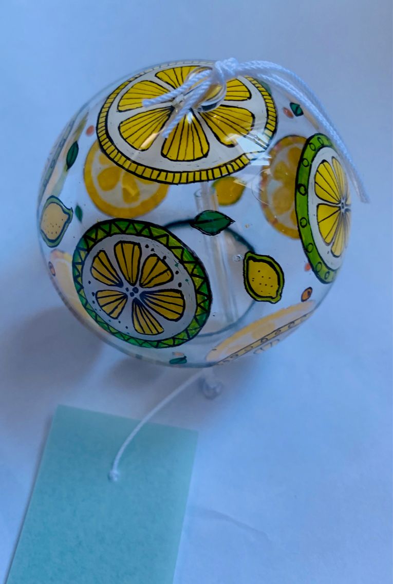 ④江戸風鈴:オリジナル・オーダーメイド作品として江戸風鈴・レモンを製作しました。ある高校の風鈴デザインコンテストで入賞した作品のデザイン画から江戸風鈴を製作して欲しいとの依頼によって篠原風鈴さんに製作頂きました。再現性が素晴らしく賞品として授与された学生さんや周囲の方の絶賛を頂きました。